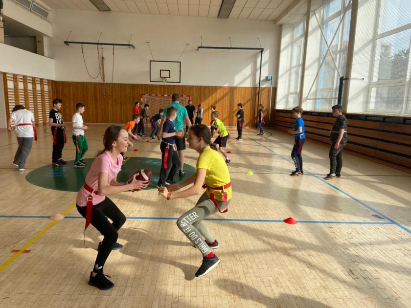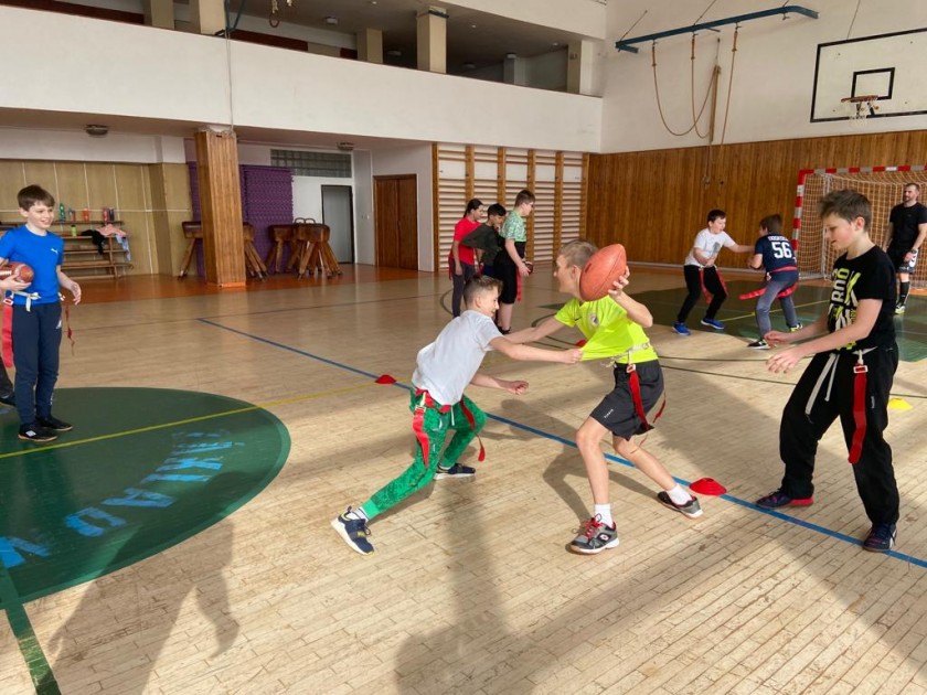 V průběhu minulých dvou týdnů si žáci druhého stupně vyzkoušeli v rámci hodiny TV netradiční sport, americký fotbal. Program hodiny měl na starost trenér Aleš z brněnského týmu Alligators. Žáci si vyzkoušeli bezkontaktní formu obranné i útočné činnosti s míčem se speciálními pomůckami, chytání i házení. Hodiny probíhali v pozitivním a energickém duchu, u čehož mi jistě dáte za pravdu, že je u sportu to nejdůležitější. :)