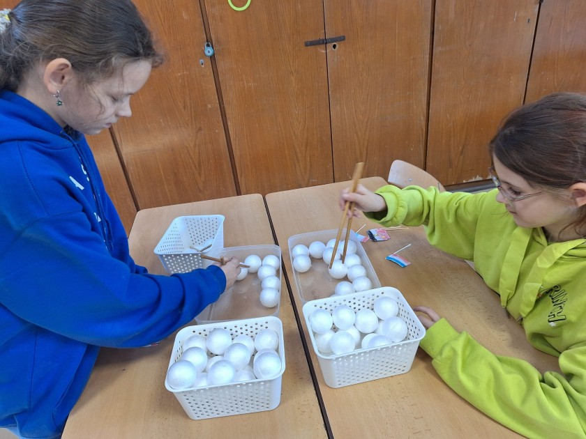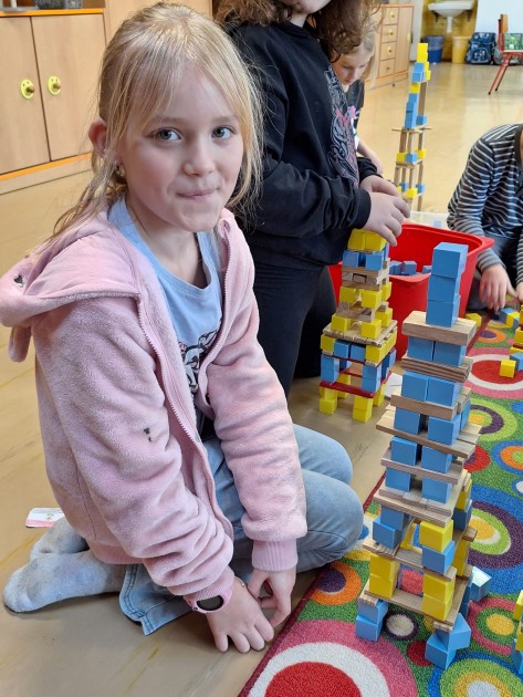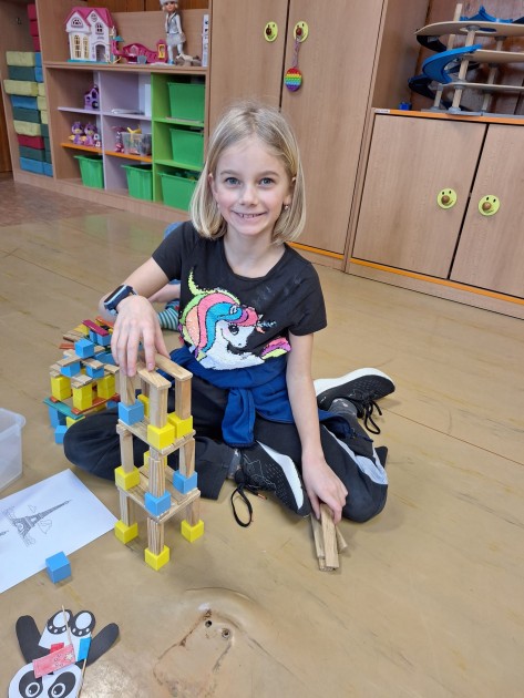A pro Čínu je typická její zeď (nám stačila z domina), vzácná panda (papírovou si děti odnáší domů) a obědvání s hůlkami (to bylo veselo, když se kuličky nedaří nabrat).