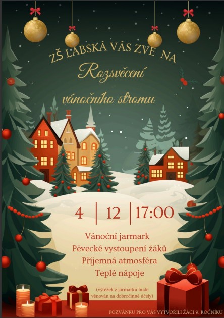 Srdečně Vás zveme na slavnostní rozsvěcení vánočního stromečku v prostorách naší školy dne 4.12. od 17:00 doprovázeného příjemnou atmosférou a tradičním jarmarkem, jehož výtěžek bude věnován na dobročinné účely. Zazní zde koledy v podání našich pěveckých sborů a atmosféru provoní i lahodný dětský punč. Těšíme se na Vás!!!